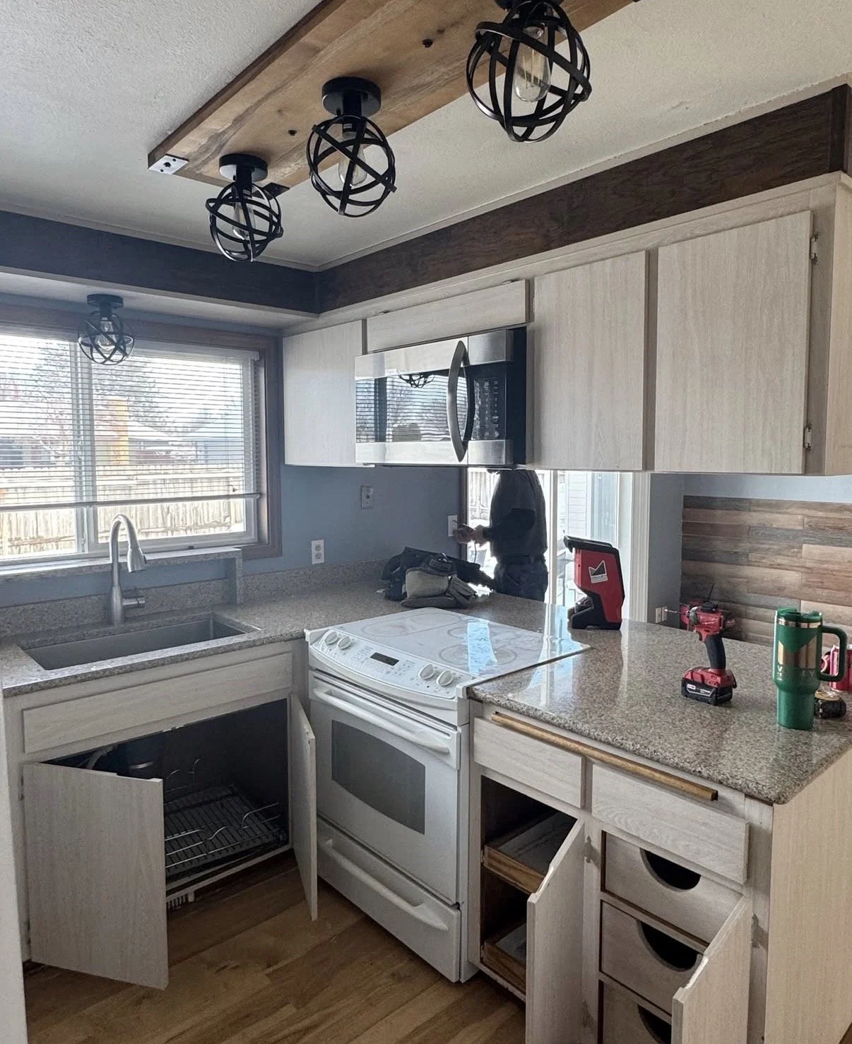 The transformation came through thoughtful layout changes and strong material choices. Durable, high-quality finishes ensure longevity. Custom cabinetry provides abundant storage. Layered lighting — from overhead fixtures to under-cabinet task lighting and statement island pendants — creates flexibility for everyday living and entertaining.