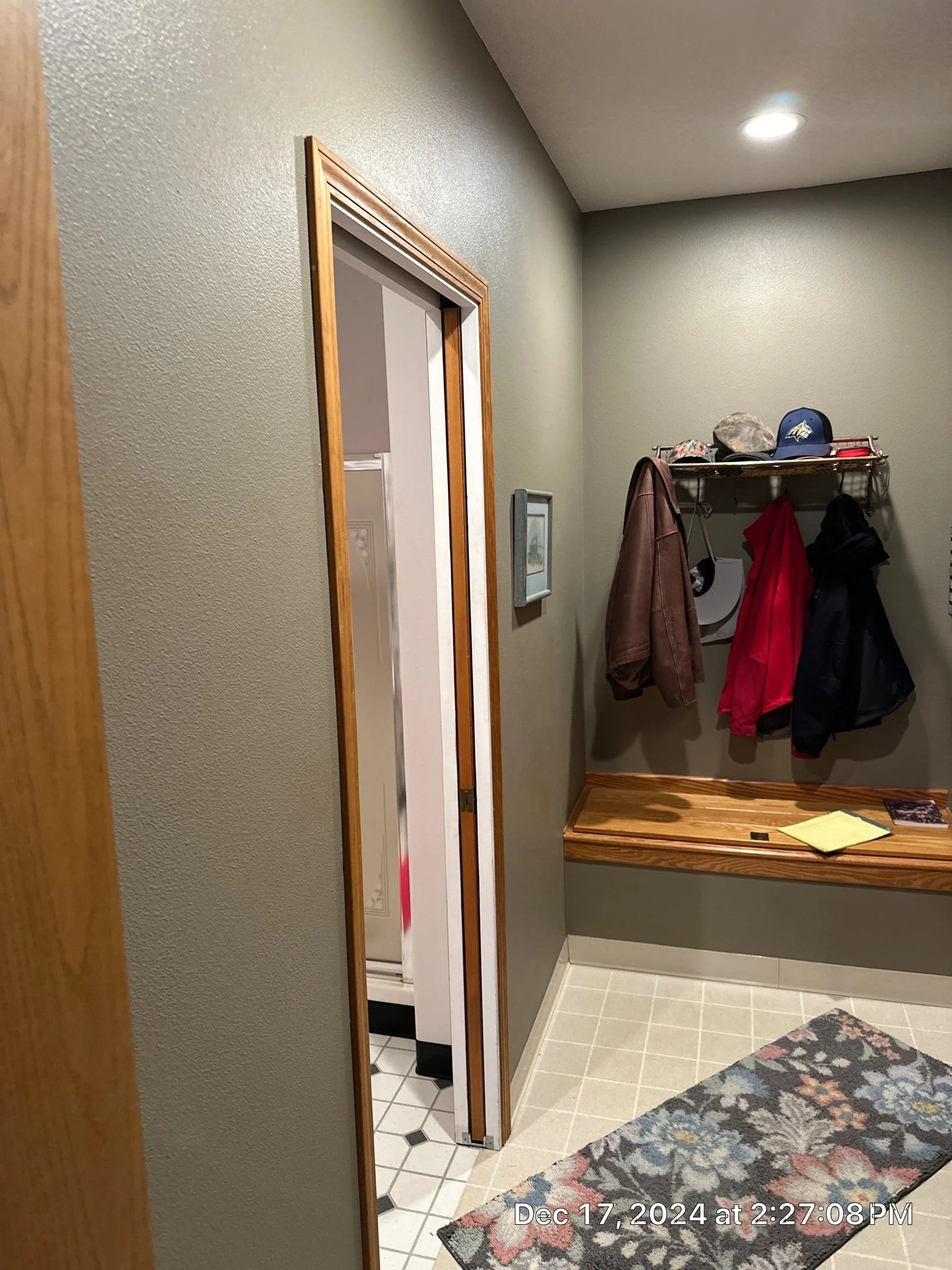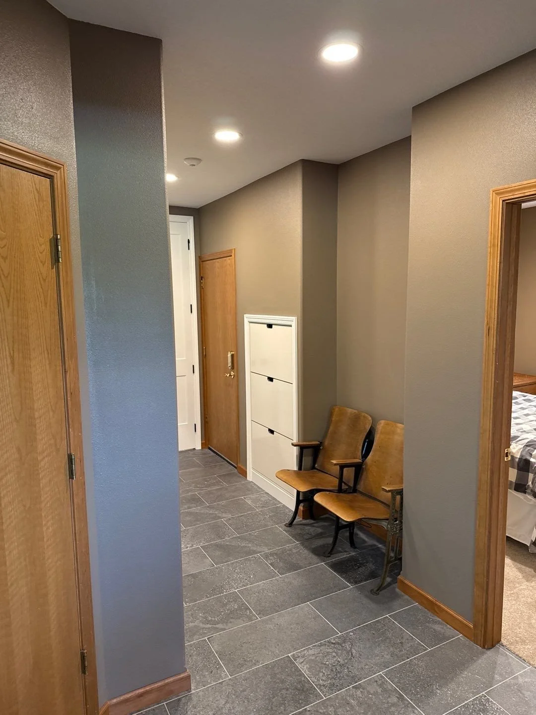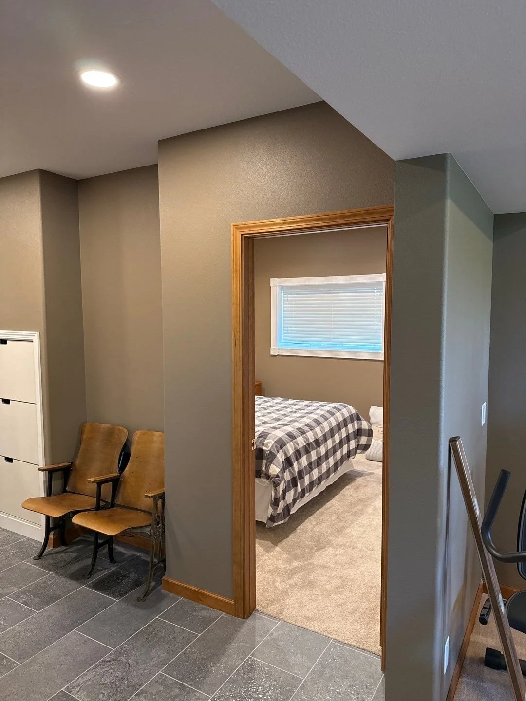 Built in 1990, this well-constructed home had strong bones but a cramped basement entry and an outdated bathroom. The narrow hallway from the garage created a bottleneck, and the existing shower made the bathroom feel dark and tight.